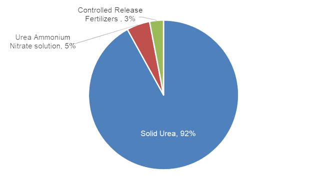 Global consumption of Urea in the Agriculture industry was 136 million tons (equivalent to 63.6 million tons of Nitrogen) in 2019. This includes solid urea, Urea Ammonium Nitrate solution (UAN), and Controlled Release Fertilizers (CRF) as demonstrated in Figure :